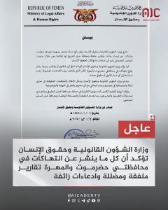 اصدرت وزارة الشؤون القانونية وحقوق الإنسان بيانا نفت فيه جملةً وتفصيلاً الادعاءات المتداولة حول وجود انتهاكات حقوقية في محافظتي #حضرموت و #المهرة، واكدت أنها تقارير “ملفقة” ولا أساس لها من الصحة