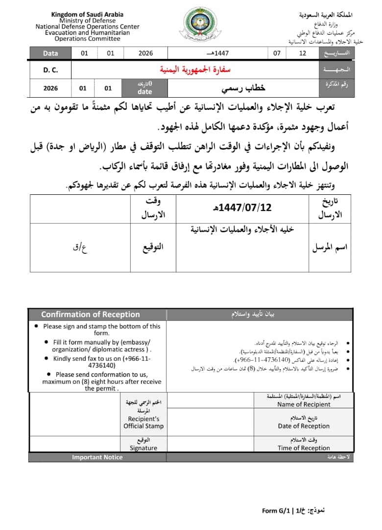 بعثت خلية الإجلاء والعمليات الإنسانية في المملكة العربية السعودية اليوم خطابا رسميا إلى سفارة الجمهورية اليمنية لدى الرياض شددت فيه على ضرورة الالتزام بالإجراءات التنظيمية الجديدة المعتمدة في الوقت الراهن.