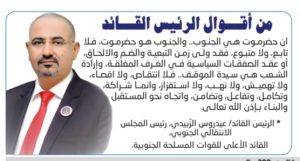ان حضرموت هي الجنوب.. والجنوب هو حضرموت، فلا تابع، ولا متبوع، فقد ولى زمن التبعية والضم والالحاق، أو عقد الصفقات السياسية في الغرف المغلقة، وإرادة الشعب هي سيدة الموقف.. فلا انتقاص، ولا اقصاء، ولا تهميش، ولا نهب، ولا استفزاز، وانما شراكة، وتكامل، وتفاعل، وتضامن، واتجاه نحو المستقبل والبناء بإذن الله تعالى.