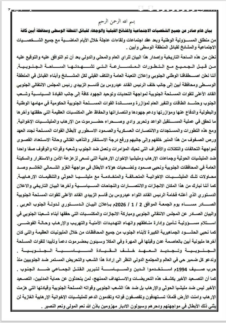 صادر عن المشائخ والشخصيات الاجتماعية في المنطقة الوسطى و محافظة أبين