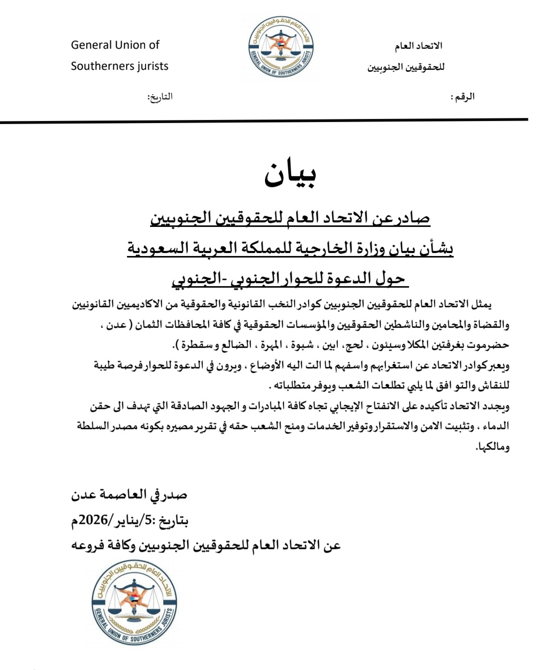 الاتحاد العام للحقوقيين الجنوبيين يصدر بيانا هاما بشأن بيان وزارة الخارجية السعودية ودعوتها للحوار الجنوبي الجنوبي