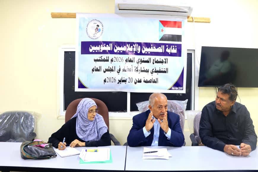 في خطوة تعكس حرصها على تقييم الأداء وتعزيز العمل المؤسسي، عقدت نقابة الصحفيين والإعلاميين الجنوبيين في العاصمة عدن، اليوم الثلاثاء، اجتماعها السنوي الأول للعام 2026م، بمشاركة واسعة من أعضاء المكتب التنفيذي والمجلس العام، خُصص لمناقشة التقرير السنوي للعام 2025م، واستعراض مجمل أنشطة النقابة، والتحديات التي واجهت العمل النقابي والإعلامي خلال المرحلة الماضية، وصولًا إلى المصادقة عليه بالإجماع.