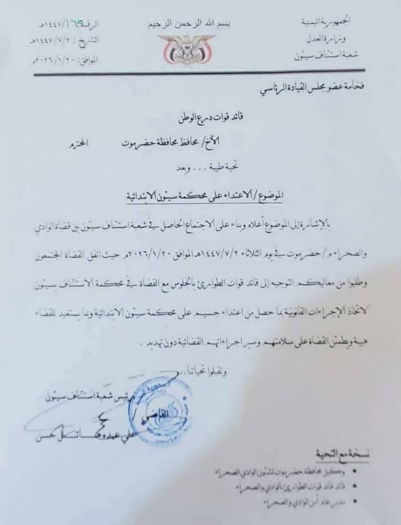 وأوضح النهدي أن تداعيات الحادثة انعكست مباشرة على سير العدالة، حيث أُغلقت محكمة سيئون، ورفض القضاة ممارسة أعمالهم «إلى حين توجيه قائد الطوارئ بمراجعة محكمة الاستئناف واتخاذ الإجراءات القانونية اللازمة بحقه»، في خطوة احتجاجية تهدف إلى حماية استقلال القضاء ومنع تكرار الانتهاكات.