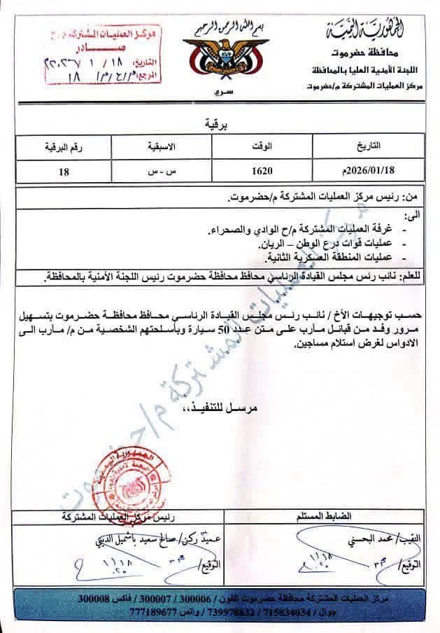 الوثيقة تؤكد أن التوجيه صدر بموافقة محافظ حضرموت، بصفته محافظًا وعضوًا في المجلس الرئاسي، ويتضمن تسهيل مرور قرابة خمسين سيارة مسلحة بغرض التوجه إلى مناطق صحراوية لاستلام مساجين، مع تسليم الأفراد أسلحتهم الشخصية.