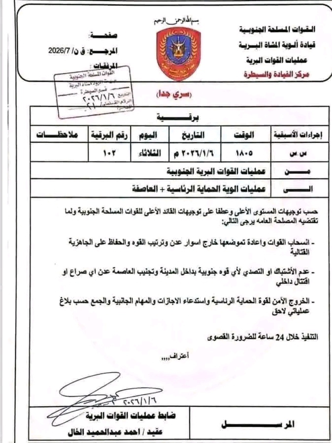 بتاريخ 6 يناير 2026 صدرت برقية من قيادة المجلس الانتقالي الجنوبي تضمنت توجيهات واضحة بـ الانسحاب خارج عدن، إعادة التموضع، وعدم مواجهة أي تشكيلات عسكرية جنوبية داخل العاصمة.