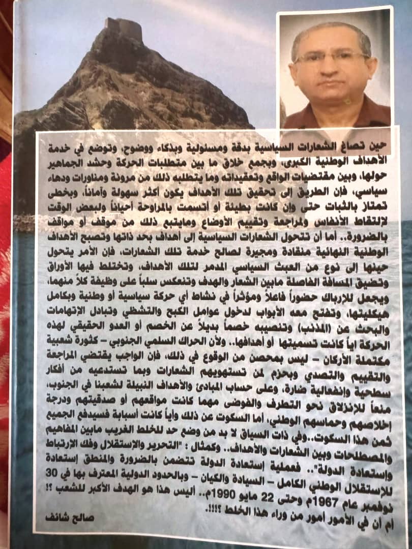 ولأن الحراك السلمي الجنوبي – كثورة شعبية مكتملة الأركان – ليس بمحصن من الوقوع في ذلك، فإن الواجب يقتضي المراجعة والتقييم والتصدي وبحزم لمن تستهويهم الشعارات وبما تستدعيه من أفكار سطحية وإنفعالية ضارة، وعلى حساب المبادئ والأهداف النبيلة لشعبنا في الجنوب. منعا للإنزلاق نحو التطرف والفوضى مهما كانت مواقعهم أو صدقيتهم ودرجة اخلاصهم وحماسهم الوطني، أما السكوت عن ذلك وأيا كانت أسبابه فسيدفع الجميع ثمن هذا السكوت..