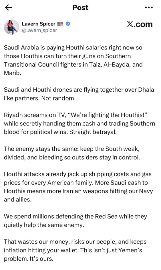 الرياض تصرخ عبر التلفاز: ‘نحن نحارب الحوثيين!’ بينما في السر تسلمهم الأموال وتتاجر بدماء الجنوبيين مقابل مكاسب سياسية. هذه خيانة صريحة.