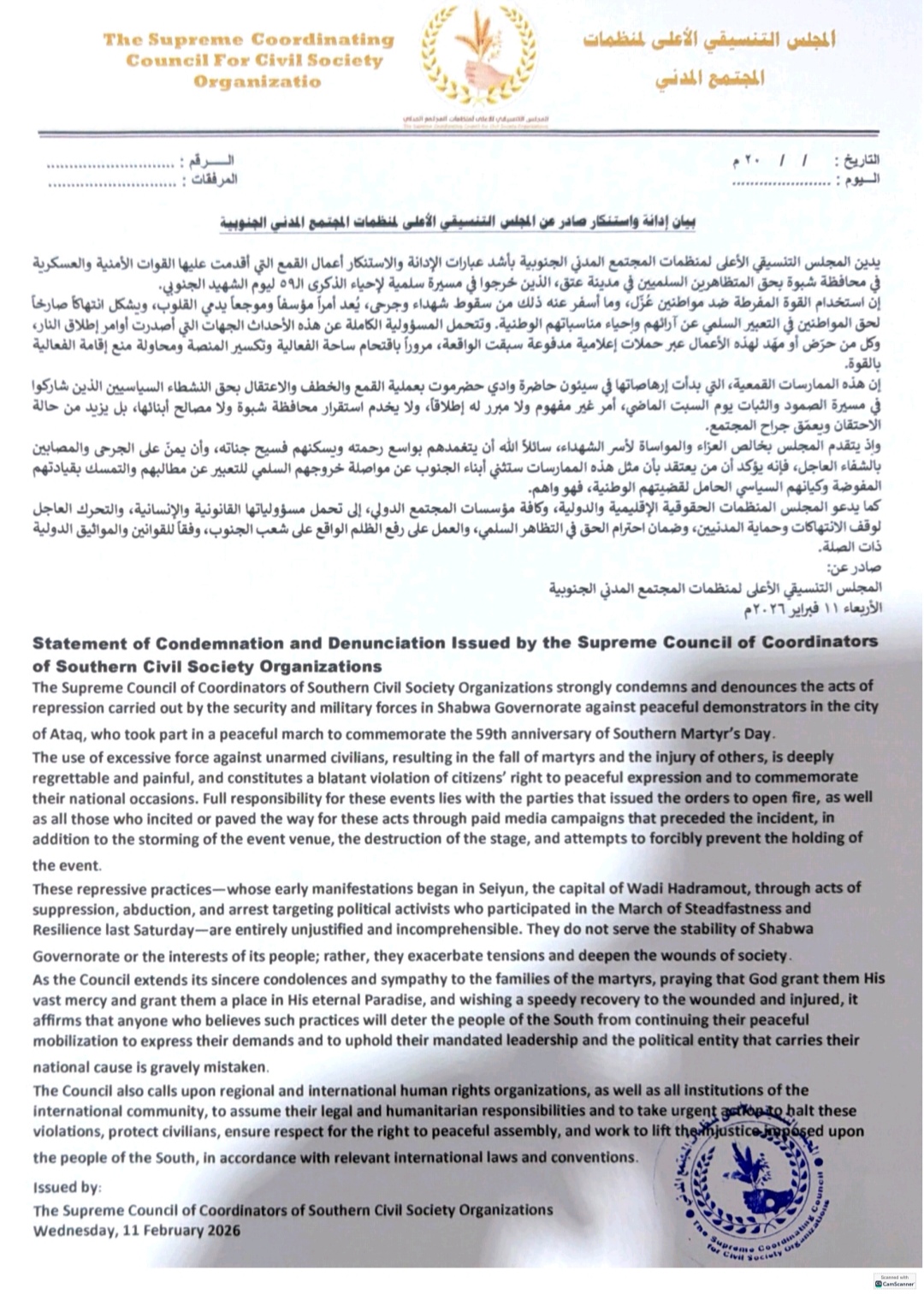 يدين المجلس التنسيقي الأعلى لمنظمات المجتمع المدني الجنوبية بأشد عبارات الإدانة والاستنكار أعمال القمع التي أقدمت عليها القوات الأمنية والعسكرية في محافظة شبوة بحق المتظاهرين السلميين في مدينة عنق، الذين خرجوا في مسيرة سلمية لإحياء الذكرى ال٥٩ ليوم الشهيد الجنوبي