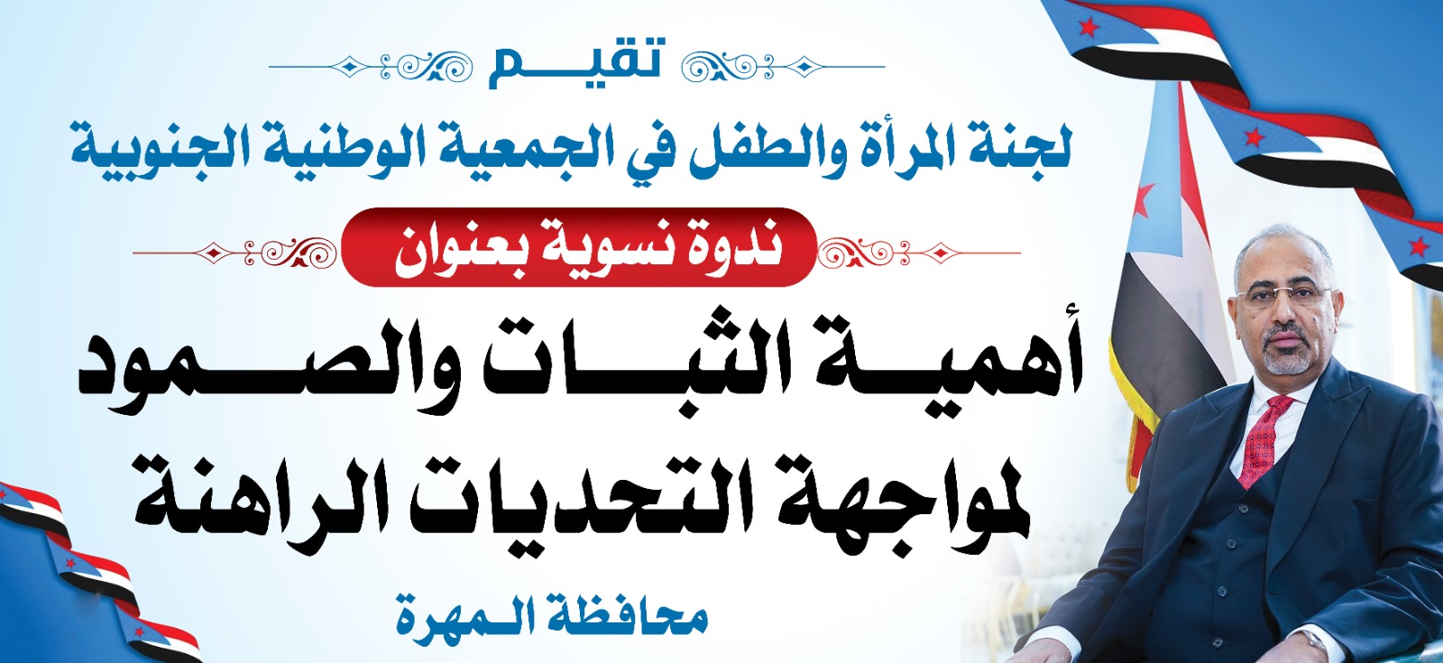 نفذت لجنة المرأة والطفل في الجمعية الوطنية الجنوبية، اليوم، ندوة توعوية نسوية حول أهمية الثبات والصمود في مواجهة التحديات الراهنة، وتعزيز دور المرأة الجنوبية في المرحلة الحالية.
