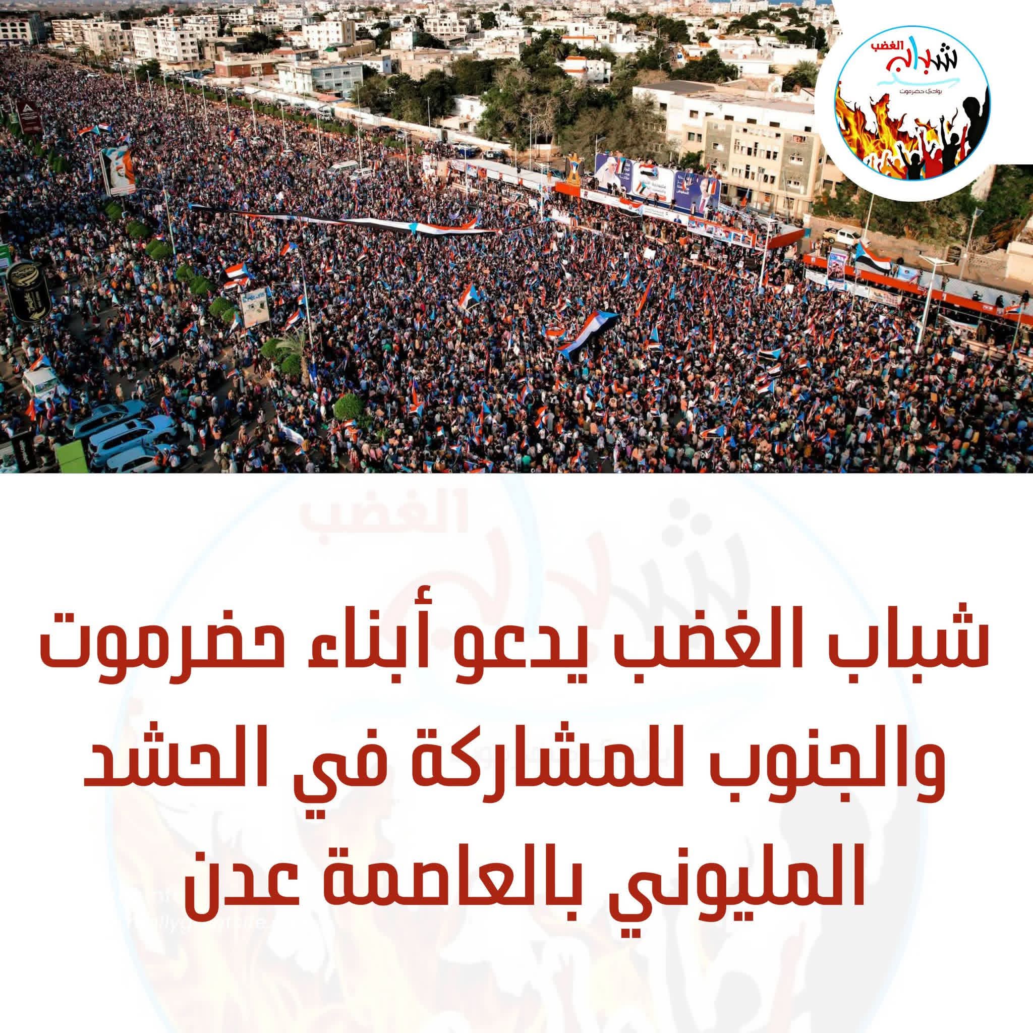 وعليه، يهيب شباب الغضب كافة أبناء حضرموت والجنوب إلى المشاركة الواسعة في المليونية، والالتزام بالسلمية والانضباط، ليكون الحضور صورة حضارية تعكس وعي شعب الجنوب وعدالة قضيته.