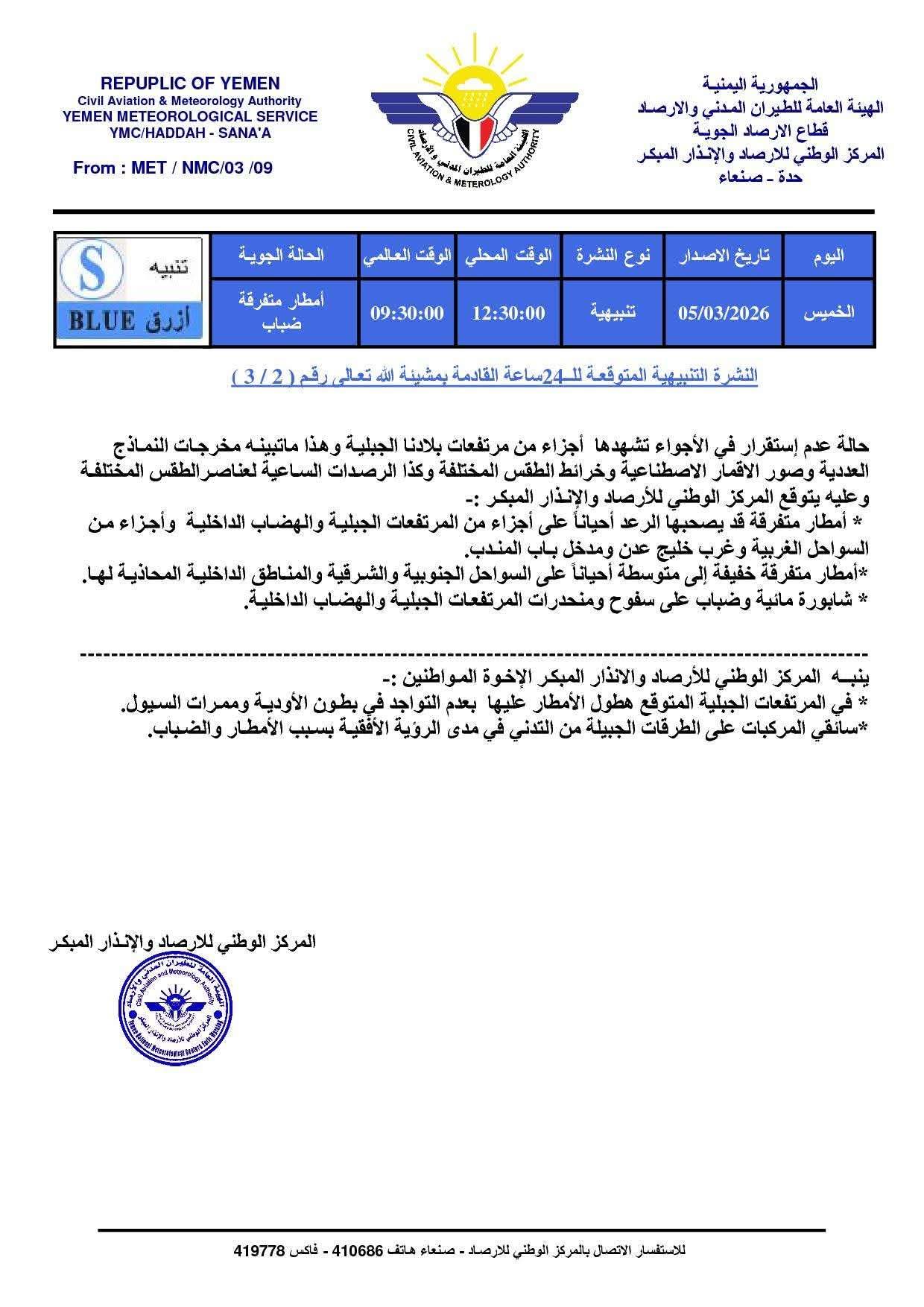 أصدر المركز الوطني للأرصاد والإنذار المبكر، التابع للهيئة العامة للطيران المدني والأرصاد، نشرة تنبيهية حول الحالة الجوية المتوقعة خلال الـ24 ساعة القادمة، محذرًا من حالة عدم استقرار في الأجواء تشهدها أجزاء من المرتفعات الجبلية في .