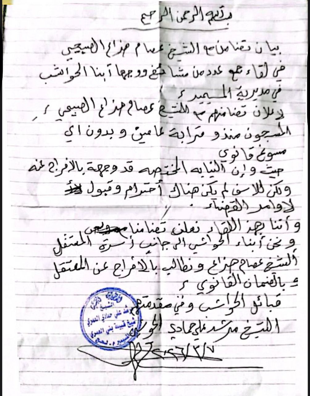 بيان تضامن مع الشيخ عصام هزاع الصبيحي