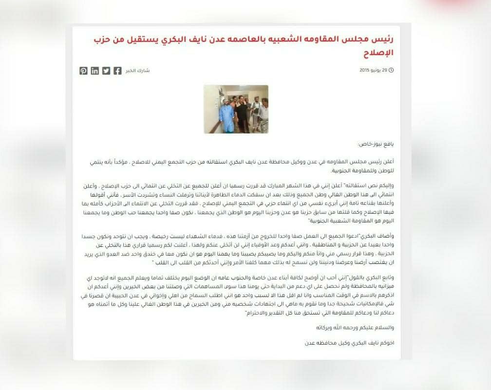 وقال اليافعي متسائلًا: «إذا كان حزب الإصلاح بطل تحرير عدن بحسب ما يزعم نشطاء الحزب، فلماذا قدم نايف البكري استقالته من الحزب قبل معارك تحرير عدن بشهر؟».