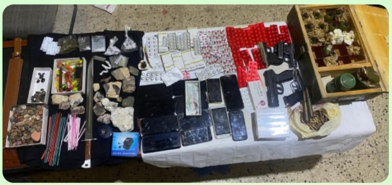 كما أسفرت عملية التفتيش عن ضبط عدد 12 هاتفاً نقالاً يُعتقد أنها مرهونة على خلفية ترويج المخدرات، إلى جانب عدد من القنابل اليدوية وصواعق كهربائية وذخائر وأسلحة، ما يعكس خطورة نشاطه الإجرامي.