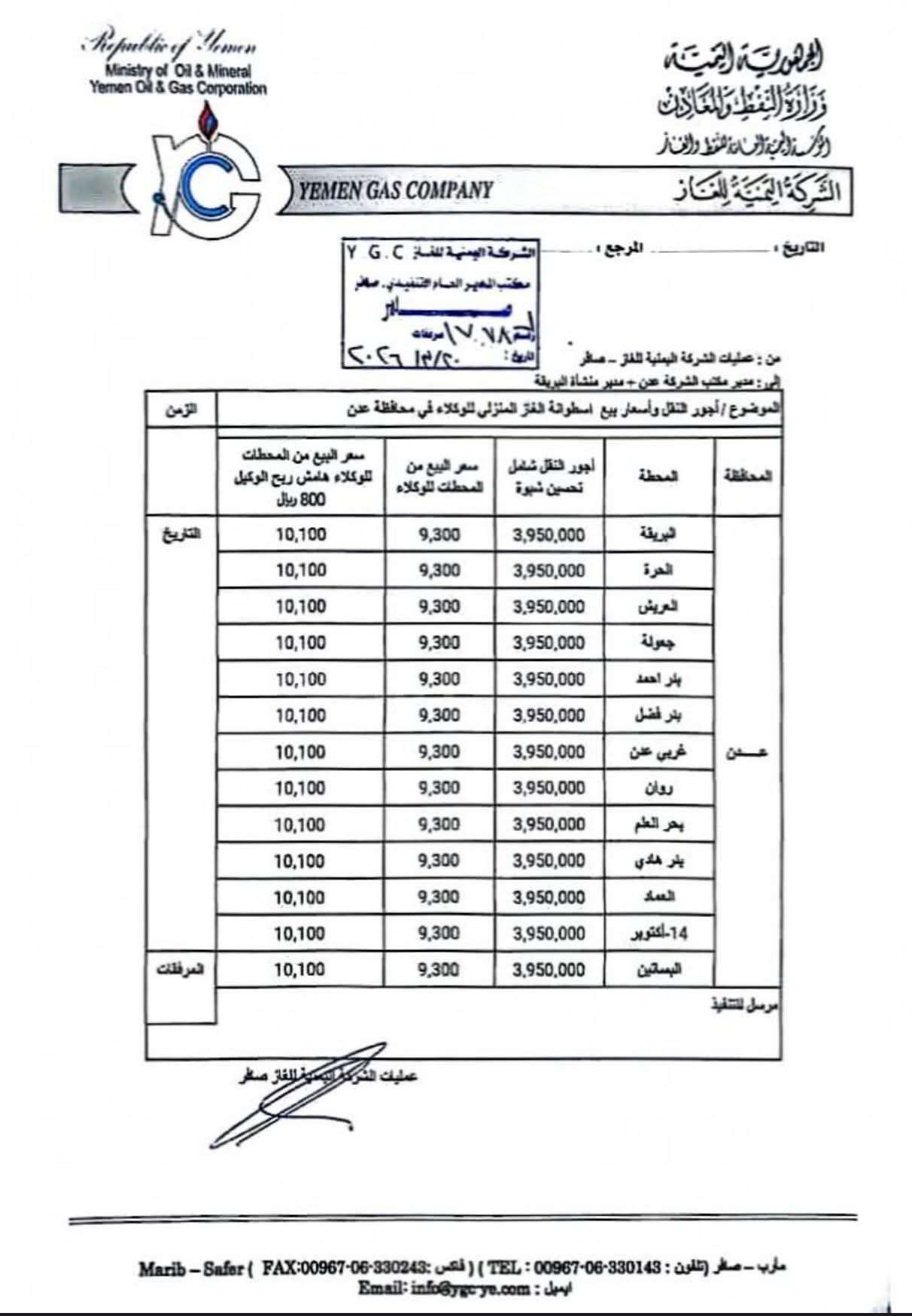 أقرت الشركة اليمنية للغاز زيادة جديدة في أسعار أسطوانات الغاز المنزلي في العاصمة عدن، وفق وثيقة رسمية متداولة مؤخرًا.
