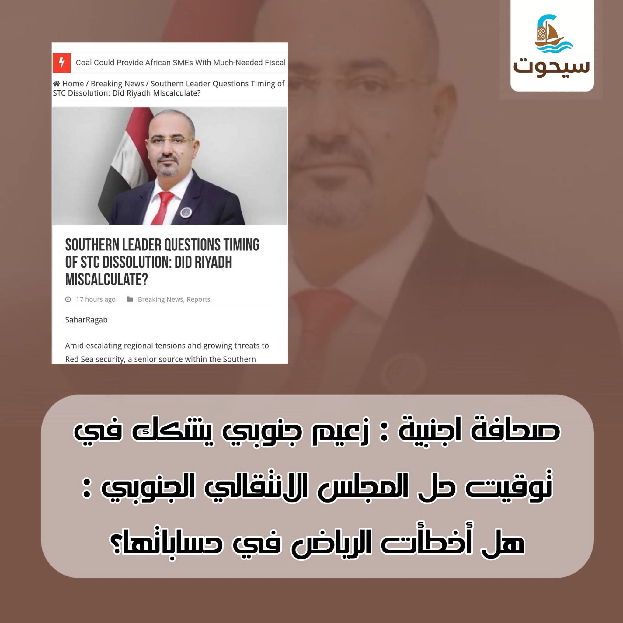 أفاد مصدر طلب عدم الكشف عن هويته بأن السعي نحو حلّ المجلس الانتقالي الجنوبي في مثل هذه اللحظة الحساسة ربما كان توقيتاً غير مناسب، لا سيما مع تصعيد جماعة أنصار الله لدورها في المواجهة الإقليمية الأوسع نطاقاً. ويشمل هذا التصعيد تهديدات بإغلاق مضيق باب المندب، أحد أهم الممرات البحرية الاستراتيجية في العالم.