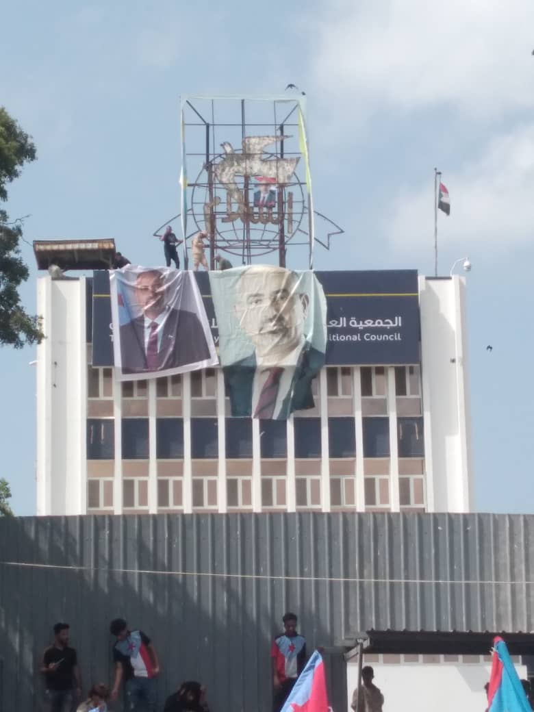 _تم فتح مقر الجمعية الوطنية للانتقالي في التواهي ورفع صورة الرئيس القائد عيدروس الزبيدي فوق المقر من قبل شعب الجنوب وبالقوة_