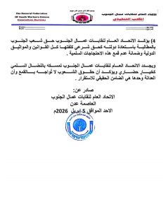 ويجدد الإتحاد العام لنقابات عمال الجنوب تمسكه بالنضال السلمي كخيارٍ حضاري ويؤكد أن حقوق الشعوب لا تُواجه بالقمع وأن العدالة وحدها هي الضامن الحقيقي للاستقرار .