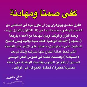 الفرق شاسع وجوهري بين أن تكون مرنا في التعاطي مع الخصم الوطني سياسيا؛ بما في ذلك التنازل المتبادل بهدف وحدة القرار والموقف؛ وبين المهادنة مع الأعداء بذريعة ( دعمهم ) لأهدافك الوطنية؛ فتلك حجة واهية ومبرر فاضح للسكوت على ما يقومون به عمليا على الأرض ضد القضية التي تحمل أمانة الدفاع عنها بشرف؛ ولذلك لم يعد ( للمهادنة ) والصمت مكانا في قاموس الفعل الوطني الصادق المدافع عن الجنوب وقضيته الوطنية؛ في لحظة مصيرية خطيرة لا تحتمل الغموض في المواقف .