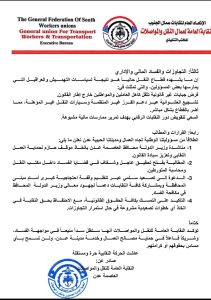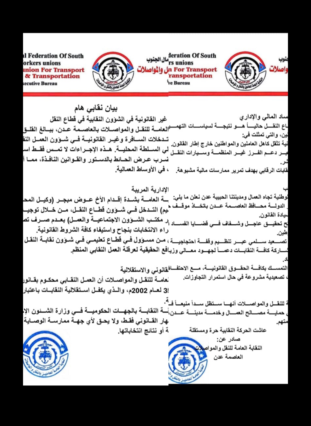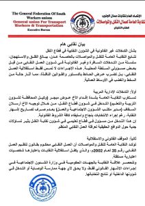 بيان هام صادر عن النقابة العامة للنقل والمواصلات – العاصمة عدن