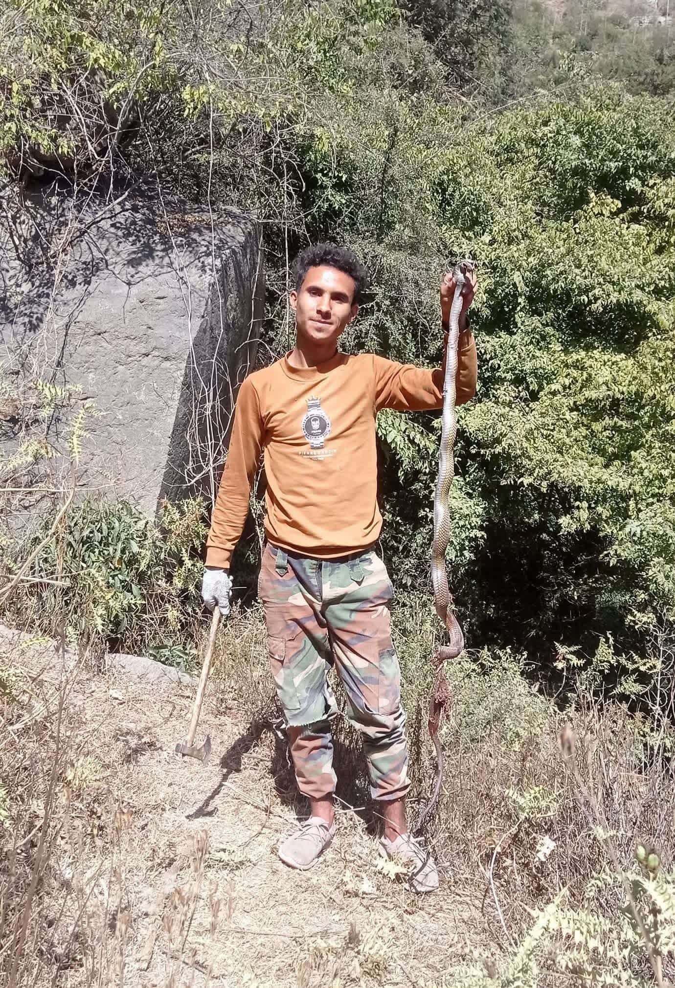 شاب يقتل أفعى ضخمة بعد إثارة الذعر بين سكان جبلة في إب