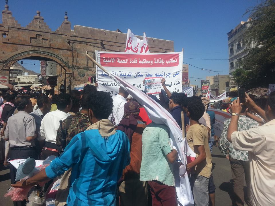 ورفع المتظاهرون لافتات تدعو لتقديم قيادات الحملة الأمنية (حملة القتل والإبادة) للمحاكمة، كما رفعوا شعارات تندد بسياسات الشرعية ( أسد أمام المدنيين ونعامة أمام الحوثيين)، ويقصدون بهم المليشيات التابعة للمدعو حمود وغزوان المخلافي الذين يديريون مجموعة من القتلة والعناصر الإرهابية تحت مسمى “قوات الحشد الشعبي” المدعومة من قطر وإيران.