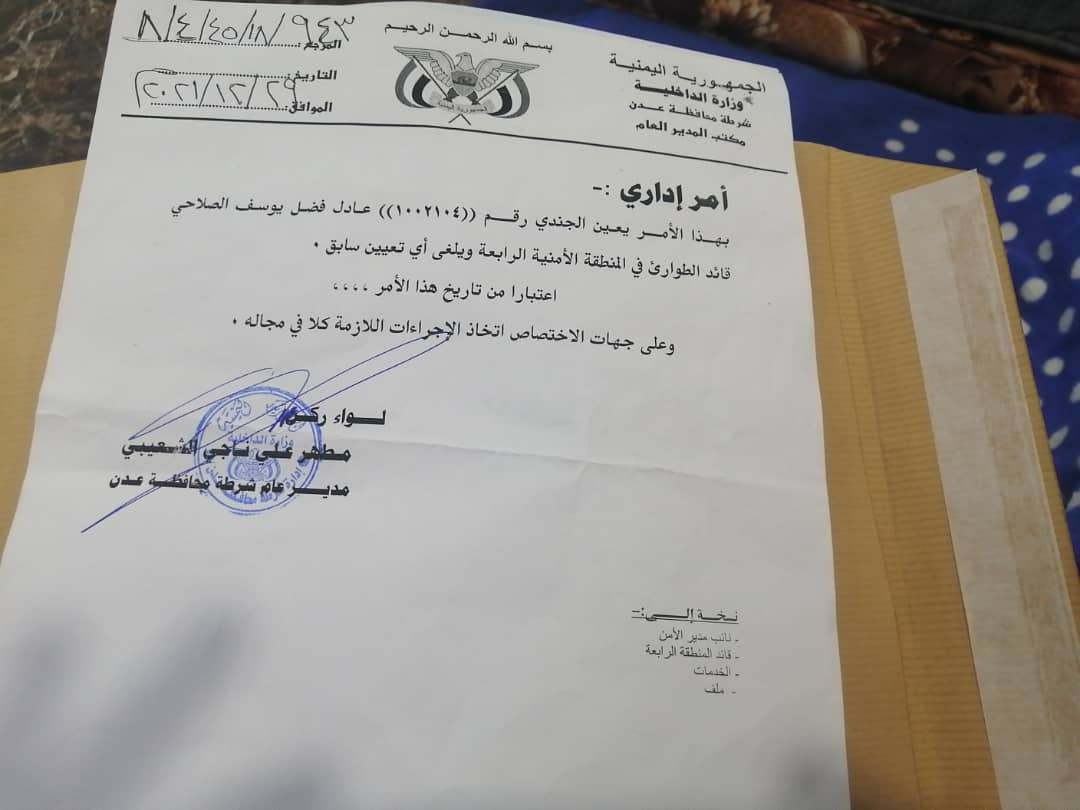 مدير أمن العاصمة عدن يصدراً أمراً إدارياً بتكليف عادل الصلاحي قائد طوارئ المنطقة الامنية الرابعة.