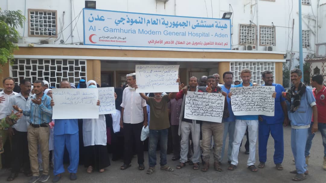 اضرابهم ووقفتهم الإحتجاجية للإسبوع الثاني ,للمطالبة بحقوقهم ومستحقاتهم ويناشدون محافظ عدن احمد لملس بتشكيل لجنة للتحقيق في فساد إدارة مستشفى الجمهورية., وكما عبر المعتصمون انهم يعانون من تردي الخدمات وسوء معاملة الادارة لهم وفسادها.