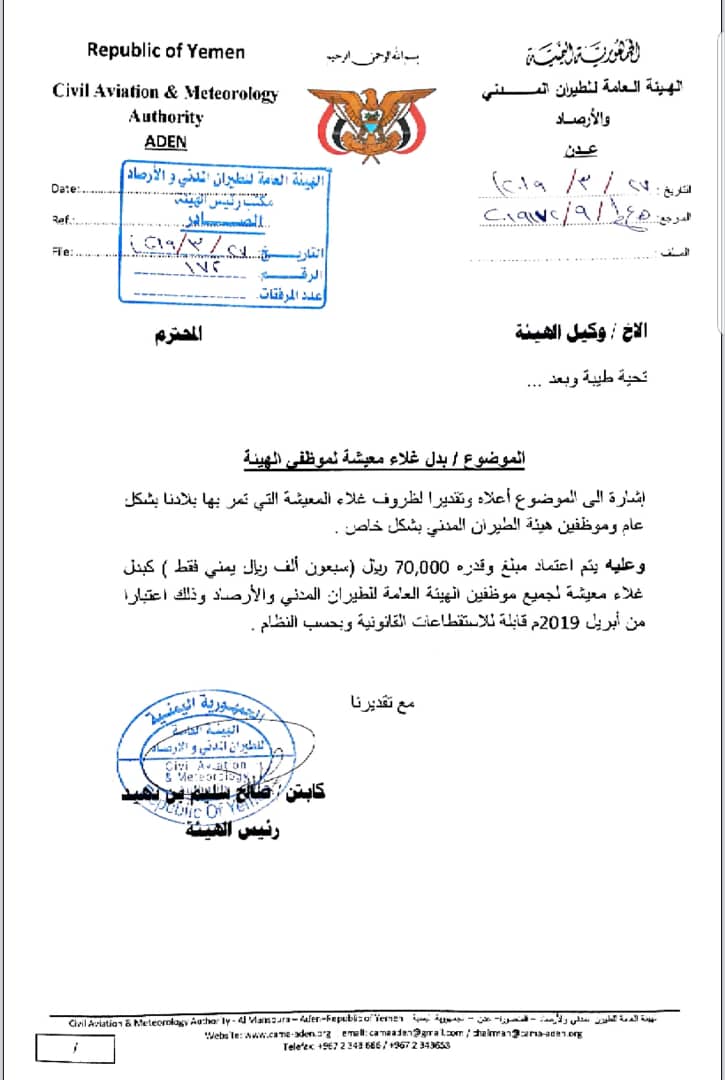 واشارت الرسالة الى انه تقديراً ونظرا لظروف غلاء المعيشية التي تمر بها البلاد بشكل عام وموظفي الهيئة بشكل خاص ، وعليه يتم اعتماد مبلغ وقدره سبعون الف ريال يمني فقط كبدل غلاء معيشة لجميع موظفي هيئة الطيران المدني والارصاد وذلك اعتبارا من واحد أبريل 2019م قابلة للاستقطاعات القانونية وبحسب النظام .