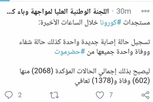 واكدت بان إجمالي الحالات المؤكدة (2068) منها (602) وفاة و(1378) تعافي.
