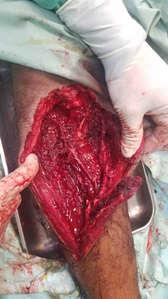 وتطرق الداعري إلى مراحل إجراء العملية حيث أوضح بأن الشاب أصيب في ساقه الأيمن أدى إلى فقد جزء من عظمة الساق وتهتك في العضلات والأنسجة ،حيث اسعف الى عدد من المستشفيات في عدن وقرر له الأطباء بتر ساقه نتيجة لحالة الإصابة البليغة ،وتابع مدير الدائرة الصحية تم عرض الحالة على أحد كوادر الدائرة الصحية استشاري في العظام والمفاصل وبعد المعاينة قام بإجراء عملية جراحية اولى لتنظيف جرح ملوث وعضلات متهتكة وعظمة الساق المهشمة،وبعد ثلاثة أيام من إجراء العملية الأولى ادخل مرة أخرى غرفة العمليات وأجريت له عملية تقييم الساق وتنظيفة،وبعد ستة أيام أجريت له عملية ثالثة تم تقييم الجرح من خلال المحافظة على نظافته والحفاظ على ساقه وتجنب بترها من الركبة ،بعدها قرر تعويض العظم المفقود بنقل عظمة الشظية ومن ثم تثبيت الساق بمثبت خارجي، مؤكدا بأن هذه العملية تعد كبرى ومعقدة .