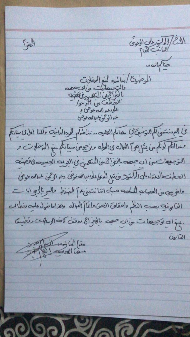 مطالبة النائب العام بمنع أي توجيهات تريد اخرج المتهمين لضمان عدم ضياع حقوقهم ، والسير بالقضية وفق الإجراءات القانونية حسب النظم واحقاق الحق واتمام العدالة .