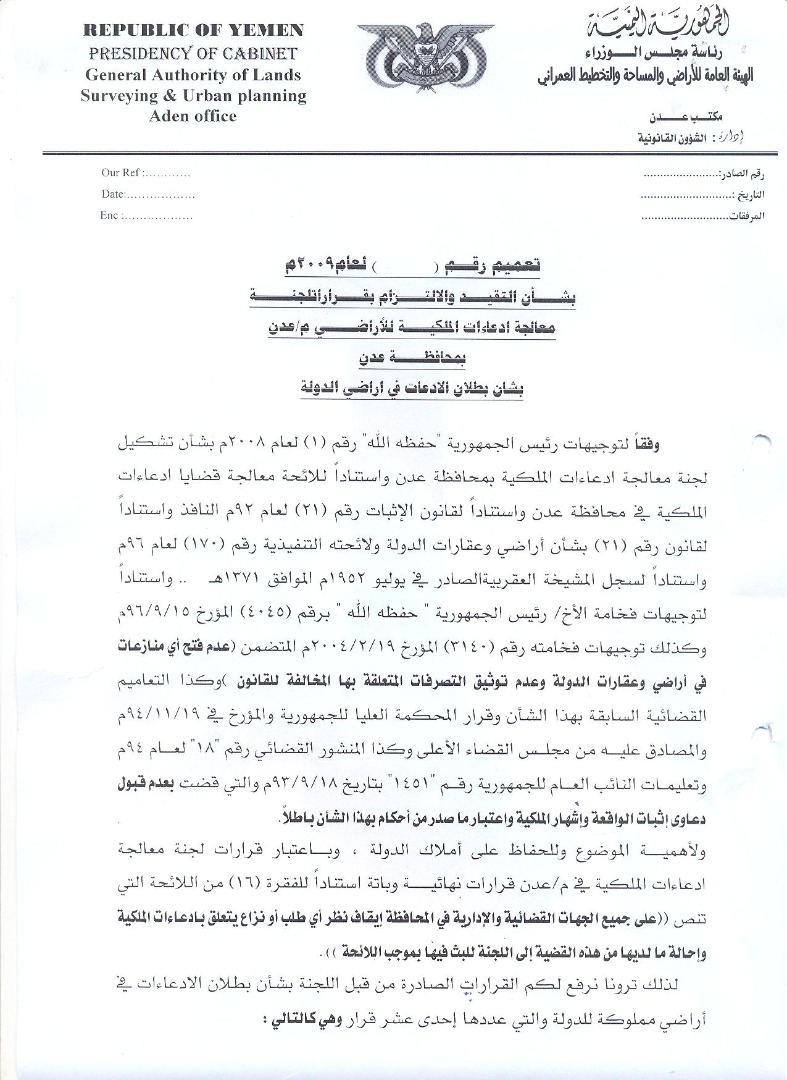 6- صادر بعدن بتاريخ 3/8/2009م وباعتبار قرارات لجنة معالجة ادعاءات الملكية في م / عدن قرارات نهائية وباتة استنادا للفقرة (16) من اللائحة التي تنص على جميع الجهات الإدارية والقضائية في المحافظة إيقاف أي طلب أو نزاع يتعلق بادعاءات الملكية وإحالة ما لديها من هذه القضايا إلى اللجنة للبت فيها بموجب اللائحة )) وقد اعتمدت هذه اللائحة من قبل رئيس الجمهورية ولم يطعن بقرارات اللجنة مما أكسبها التحصن من الظن وحجية الأمر المقضي فإن أي ادعاء في م/عدن لم يصدر بصحته قرار من اللجنة يعتبر بــاطــلاً وتعتبر الأراضي أراضي مملوكةً للدولة وهي له الحق بتخطيطها صرفها سوى مواطن او مشاريع استثماريه او خدميه حسب القانون ،،،