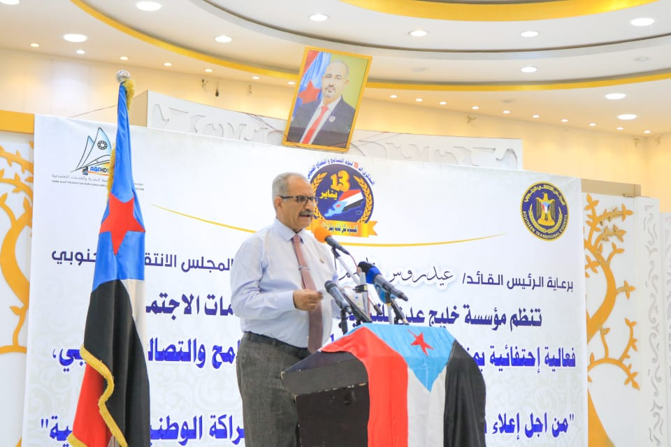 و ألقى الأستاذ فضل محمد حسين الجعدي، كلمة نقل في مستهلها تحيات الرئيس القائد عيدروس قاسم الزبيدي رئيس المجلس الانتقالي للحاضرين جمعياً، مؤكداً أن ذكرى التصالح والتسامح أكدت طي صفحة الماضي، وجسدت التوافق الوطني الجنوبي قولا وعملا، وأن الجنوب أسمى وأرفع من الأفراد والمكونات.