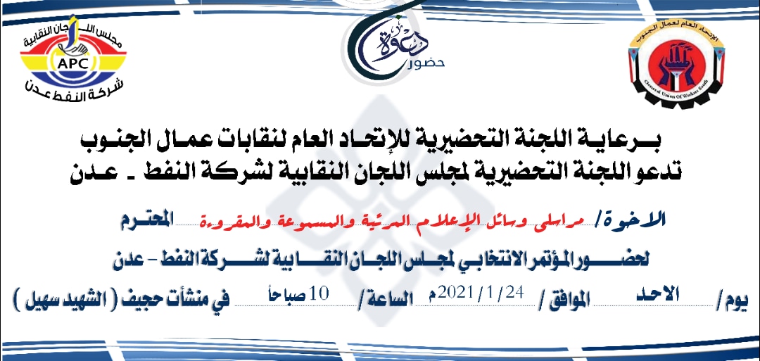وجه اتحاد نقابات عمال الجنوب دعوته لوسائل الإعلام المختلفة لحضور المؤتمر الانتخابي لمجلس اللجان النقابية لشركة النفط بالعاصمة الجنوبية عدن .
