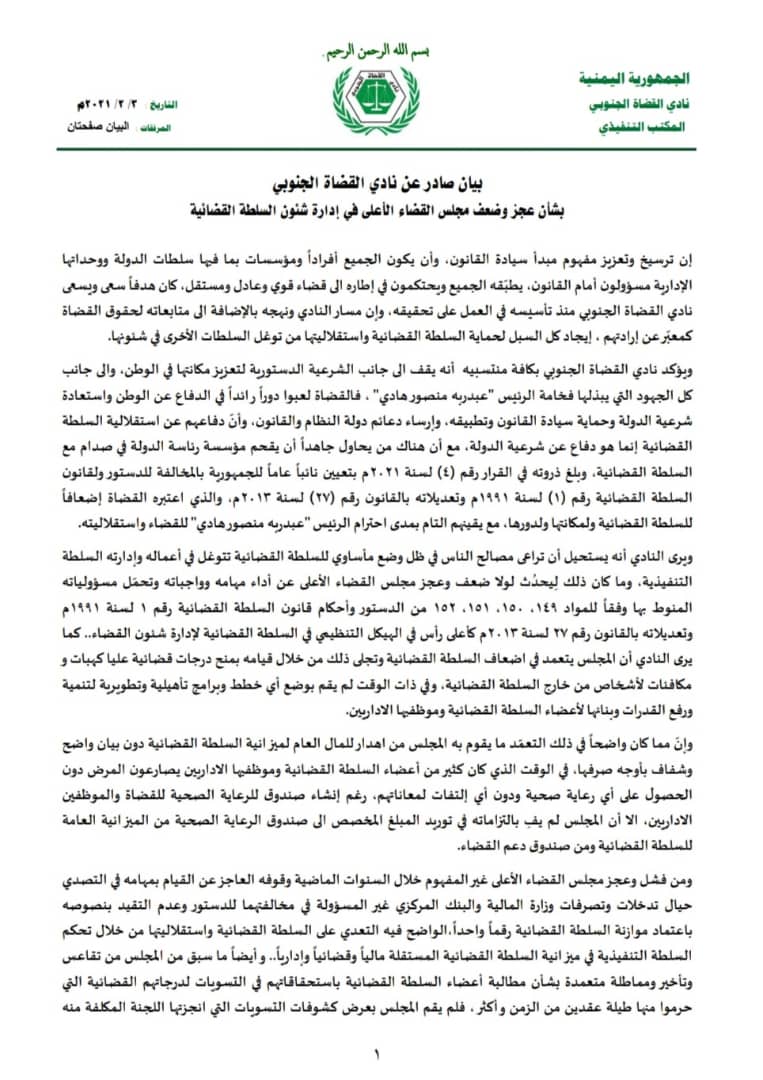 ولما كان مجلس القضاء الأعلى بوضعه الحالي يقف حجر عثرة أمام كل هذه الاستحقاقات وعاجز تماماً عن ادارة شئون السلطة القضائية، فإن نادي القضاة الجنوبي اتخذ التالي: