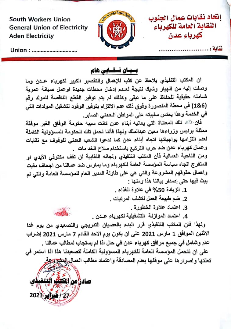 وقال بيان صادر عنه بأنه قرر التصعيد الشامل من يوم الاحد القادم الموافق ٧مارس/ ٢٠٢١م في جميع مرافق كهرباء عدن