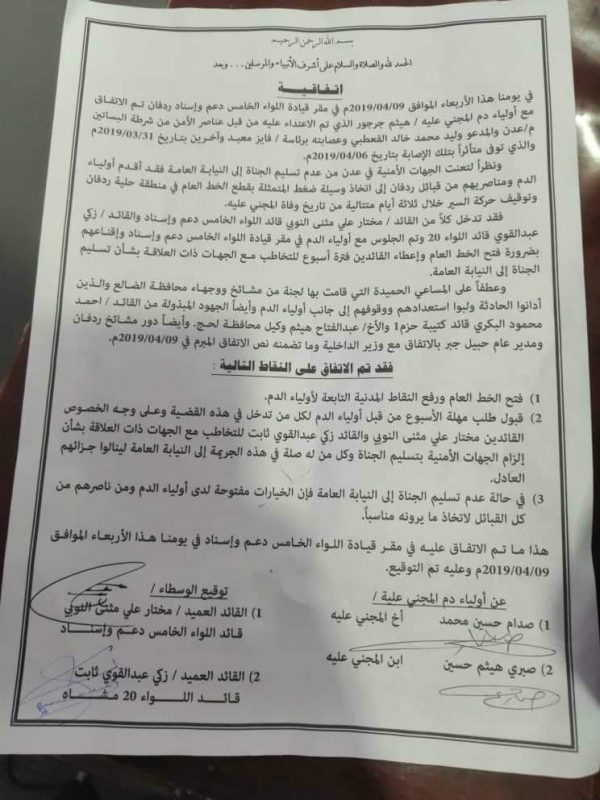 وفي تفاصيل الاتفاق الذي تم في مقر قياده اللواء الخامس دعم واسناد مع أولياء الدم فقد تم الاتفاق بالتالي :