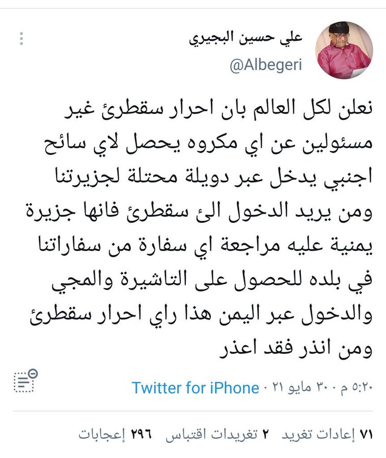 وكتب علي حسين الجبيري عضو مجلس الشورى في حكومة الاخوان في تغريدته عبر “تويتر” : اننا غير مسئولين عن اي مكروه يحصل لاي سائح أجنبي يدخل جزيرة سقطرى وميون.