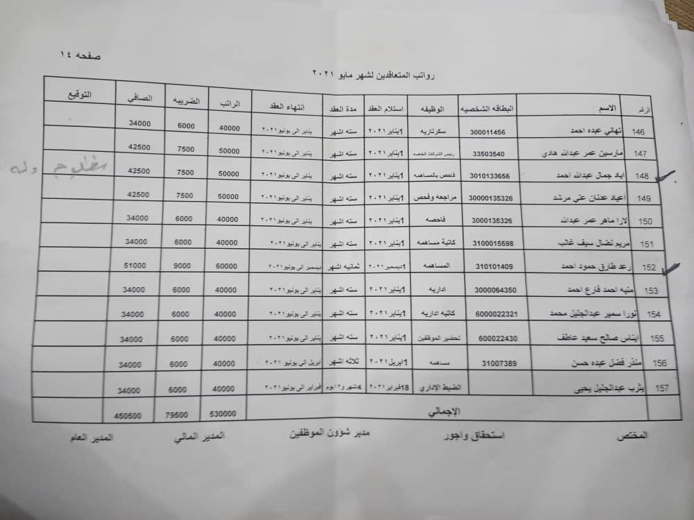 في احدى الوثائق التي حصلنا عليها تؤكد بان متعاقدا (أ -ج – ع) اكلت السنين عمره ولم تشفع له في تثبيته او رفع راتبه البالغ (25)الف ريال وبذلك لم تقوم النقابة التي انتهت شرعيتها لم تكلف نفسها مطالبة الادارة انذاك تحسين وضغه المعيشي الصعب ، بل ركلت وراء المطالبة بتعيين قيادتها ، الادارة الجديدة بقيادة الدكتورة كفاية الجازعي تفهمت لوضع المتعاقد فاصدرت قرارها برفع الراتب الى (50)الف ، هنا جن جنون احد القيادين فيما تسمى نقابة المستشفى المنتهية بالصراخ والعويل والتحريض والتجيش ضد المديرة إعلاميا ووظيفيا كونها لم ترفع راتب نجله حديث التعاقد اذ ان المبلغ يساوي اضعاف (60)الف شهريا مع ان نجله لم يبلغ سن ذاك المتعاقد المظلوم بالعمر الوظيفي ،الفارق كبير كالسماوات والارض.