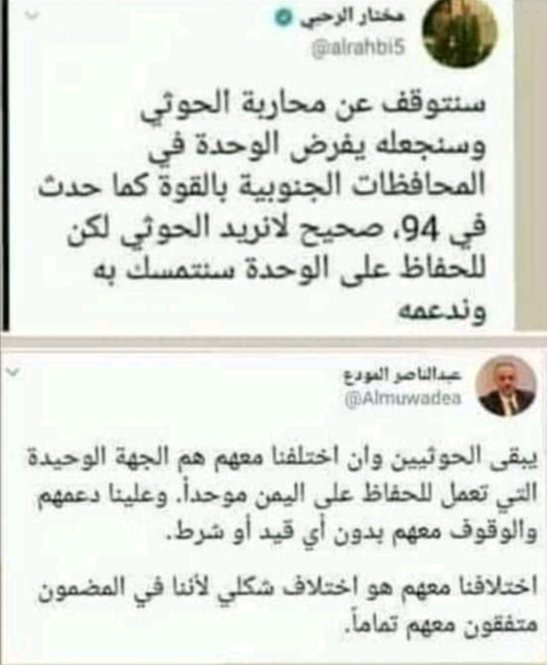 الاخوانيان الرحبي والمودع : اختلافنا مع الحوثي شكلي ومتفقين معهم في المضمون محاربة الجنوبيين وفرض الوحدة بالقوة.
