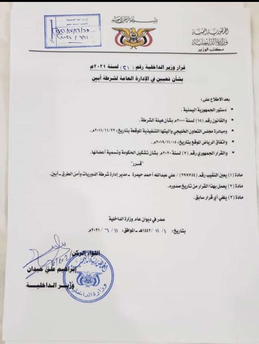 وأكد المصدر صحة كلامه بارفاق صورة قرار وزاري لوزير الداخلية الذي يُعد فضحية كبرى بحق وزارة الداخلية بتعيين أحد عناصرها والذي يحمل رقماّ عسكرياً (( 299754 )) لم يجتاز فترة الاستجداد حيث صدر فيه القرار برتبة نقيب برقمه الجندي وتعيينه مديراً إدارة شرطة الدوريات وأمن الطرق محافظة أبين ،متناسياً بأن شرطة الدوريات في قانون هيئة الشرطة (( قيادة )) وليس إدارة.