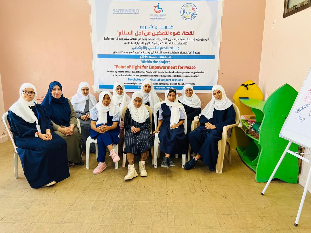 ضمن إطار مشروع ” نقطة ضوء لتمكين من أجل السلام ” والذي تموله مؤسسة بسمة حياة لذوي الاحتياجات الخاصة وبدعم من منظمة سيفرورلد ، نظمت مؤسسة الحياة للتدخل المبكر لذوي الاحتياجات الخاصة اليوم الاحد، بعدن، جلسات الدعم النفسي والاجتماعي بعنوان “أنتِي مميزة”، قدمتها المعالجة الدكتورة وفاء سعد، بحضور 15 فتاة من المؤسسة.