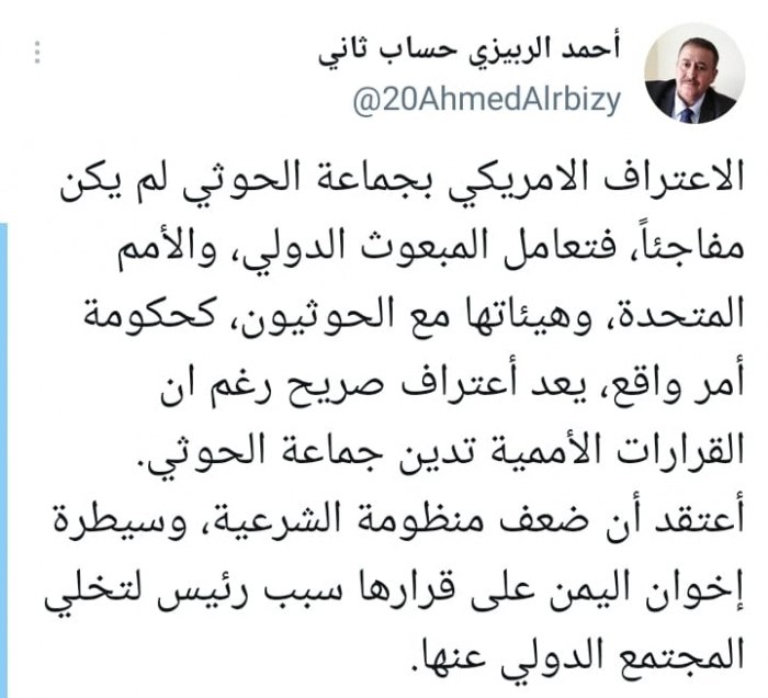 وأشار في تغريدة على حسابه بموقع التواصل الاجتماعي تويتر، اليوم إلى أن: “الاعتراف الأمريكي بجماعة الحوثي لم يكن مفاجئًا”.