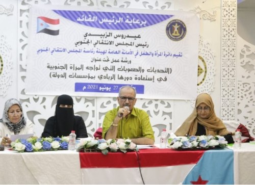 نظمت دائرة المرأة والطفل في الأمانة العامة لهيئة رئاسة المجلس الانتقالي الجنوبي، اليوم الأحد، ورشة عمل حملت عنوان “التحديات والصعوبات التي تواجه المرأة الجنوبية في استعادة دورها الريادي بمؤسسات الدولة”.