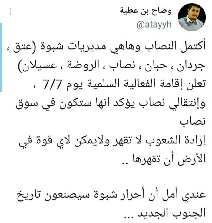 وأكد في تغريدة على حسابه “تويتر”، اليوم أنه: “اكتمل النصاب وهاهي مديريات شبوة (عتق، جردان، حبان، نصاب، الروضة، عسيلان) تعلن إقامة الفعالية السلمية يوم 7/7، وانتقالي نصاب يؤكد أنها ستكون في سوق نصاب”.