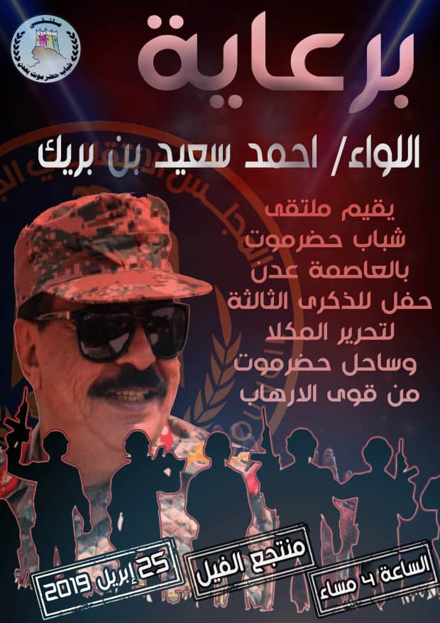 يقيم ملتقى شباب حضرموت في العاصمة عدن برعاية اللواء /أحمد سعيد بن بريك في يوم الخميس القادم الموافق 25 ابريل 2019 م حفلا بمناسبة الذكرى الثالثة لتحرير المكلا وساحل حضرموت من القوى الإرهابية الغاشمة .