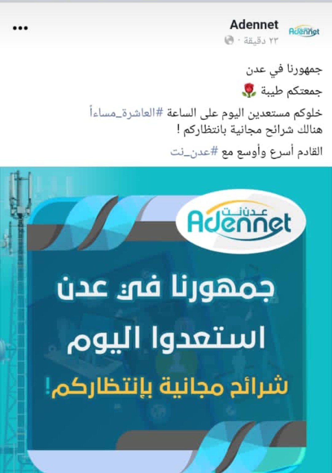 وكانت شركة عدن نت قد أعلنت قبل ساعات عن انزالها شرائح مجانية إلى السوق ، جاء ذلك في موقعها الرسمي تحت عنوان ( جمهورنا في عدن ،استعدوا اليوم – شرائح مجانية بانتظاركم.