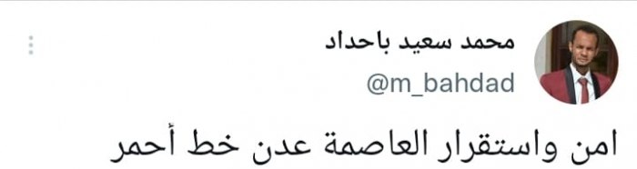 وشدد في تغريدة على حسابه بموقع التدوين المصغر تويتر، اليوم على أن: “أمن واستقرار العاصمة عدن خط أحمر”.