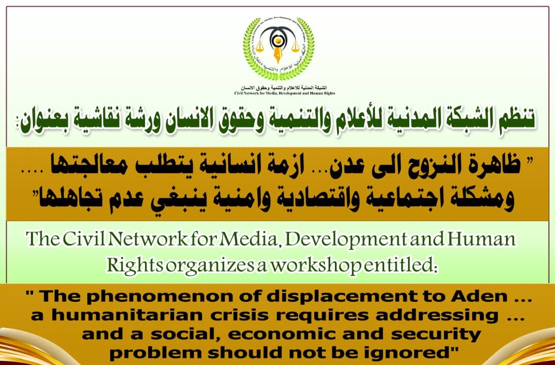 غداً الأحد .. ورشة بعنوان :” ظاهرة النزوح إلى عدن… ازمة انسانية يتطلب معالجتها…ومشكلة اجتماعية واقتصادية وامنية ينبغي عدم تجاهلها”.